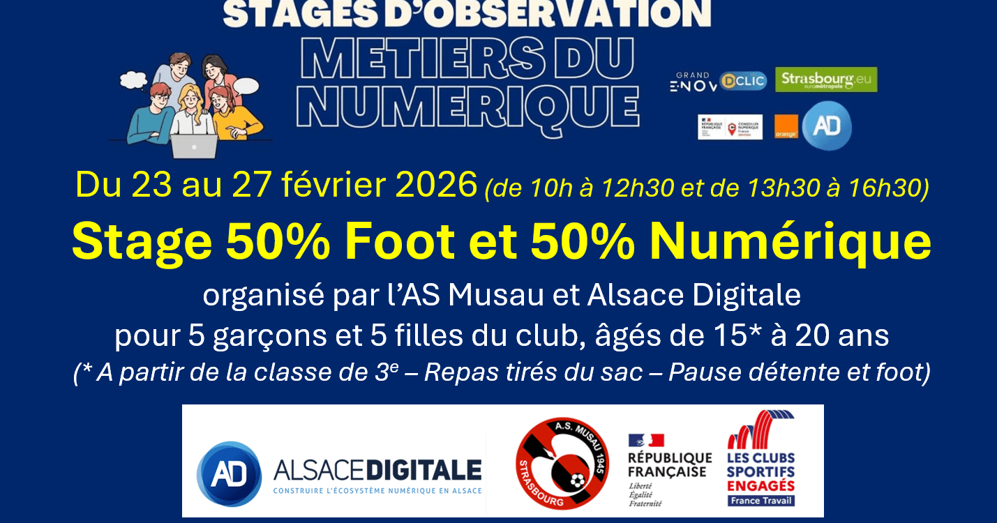 Grâce à nos partenariats, l’AS Musau et Alsace Digitale organisent un stage de découverte des métiers du numérique, destiné à 10 jeunes filles et garçons âgés de 15 ans (à partir des classes de 3e) à 20 ans. Seuls les 10 premiers inscrits – 5 filles et 5 garçons – seront retenus.