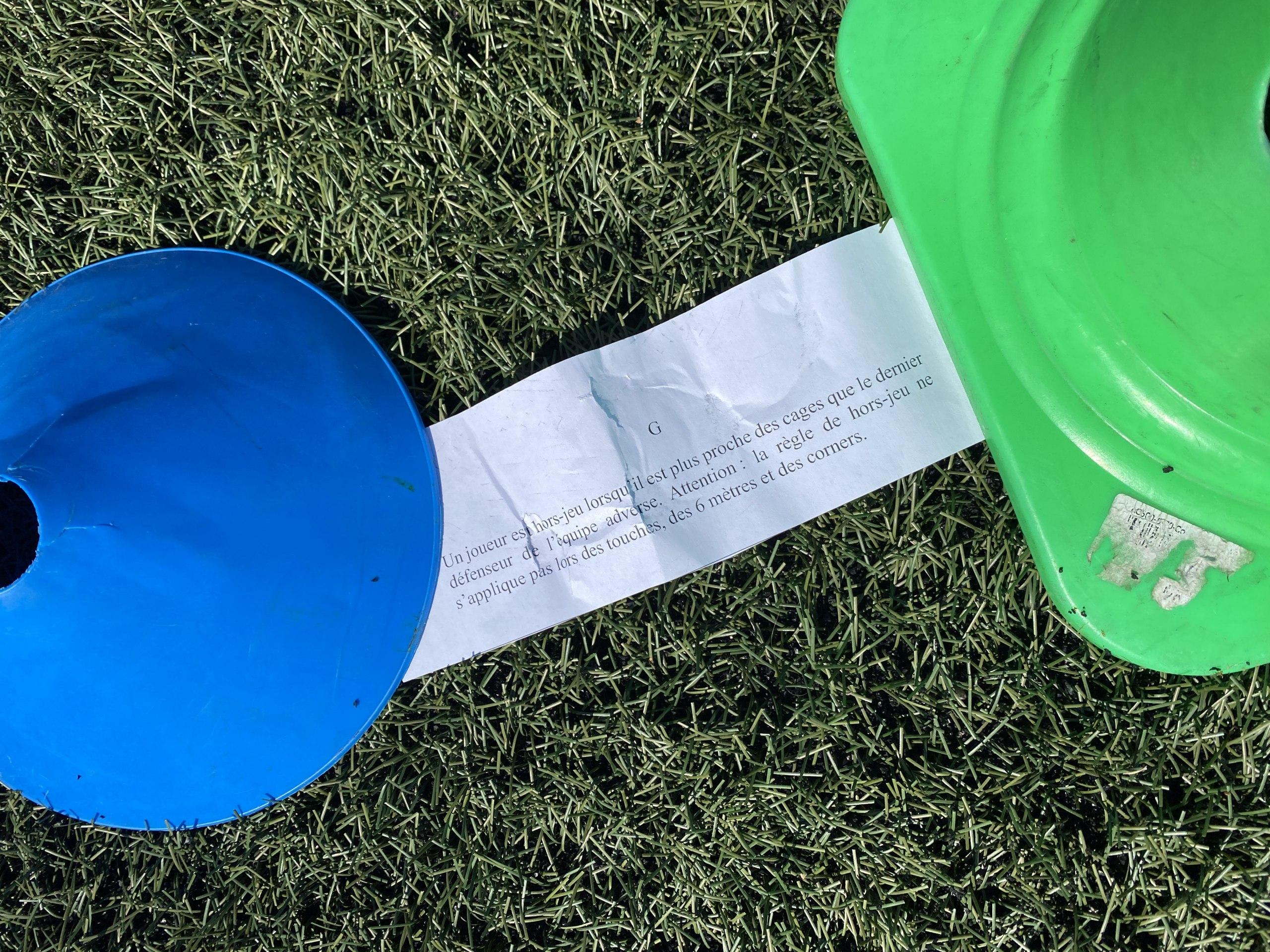 Je souhaitais également expliquer aux jeunes les divers motifs de sanction avec le carton jaune, rouge, mais aussi violet et blanc que la majorité ne connaissait pas. Pour ça, j’ai créé « l’atelier cartons » où les joueurs devaient d’abord prendre connaissance des motifs de sanction, puis trottiner tout en écoutant une situation de jeu, et enfin courir vers le carton approprié en donnant la raison de la sanction.