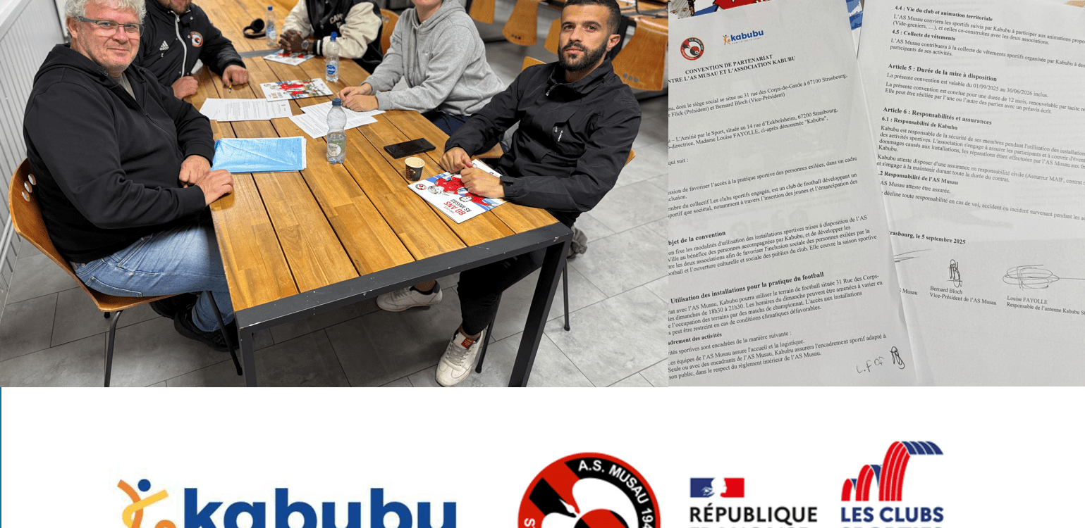 Ce 15 octobre 2025, Olivier Flick et Bernard Bloch, Président et Vice-président de l’AS Musau, et Louise Fayolle co-directrice de l’antenne Kabubu de Strasbourg, ont officialisé leur partenariat afin de favoriser l’insertion par le sport des personnes exilées, dans un cadre d’échanges et d’inclusion.