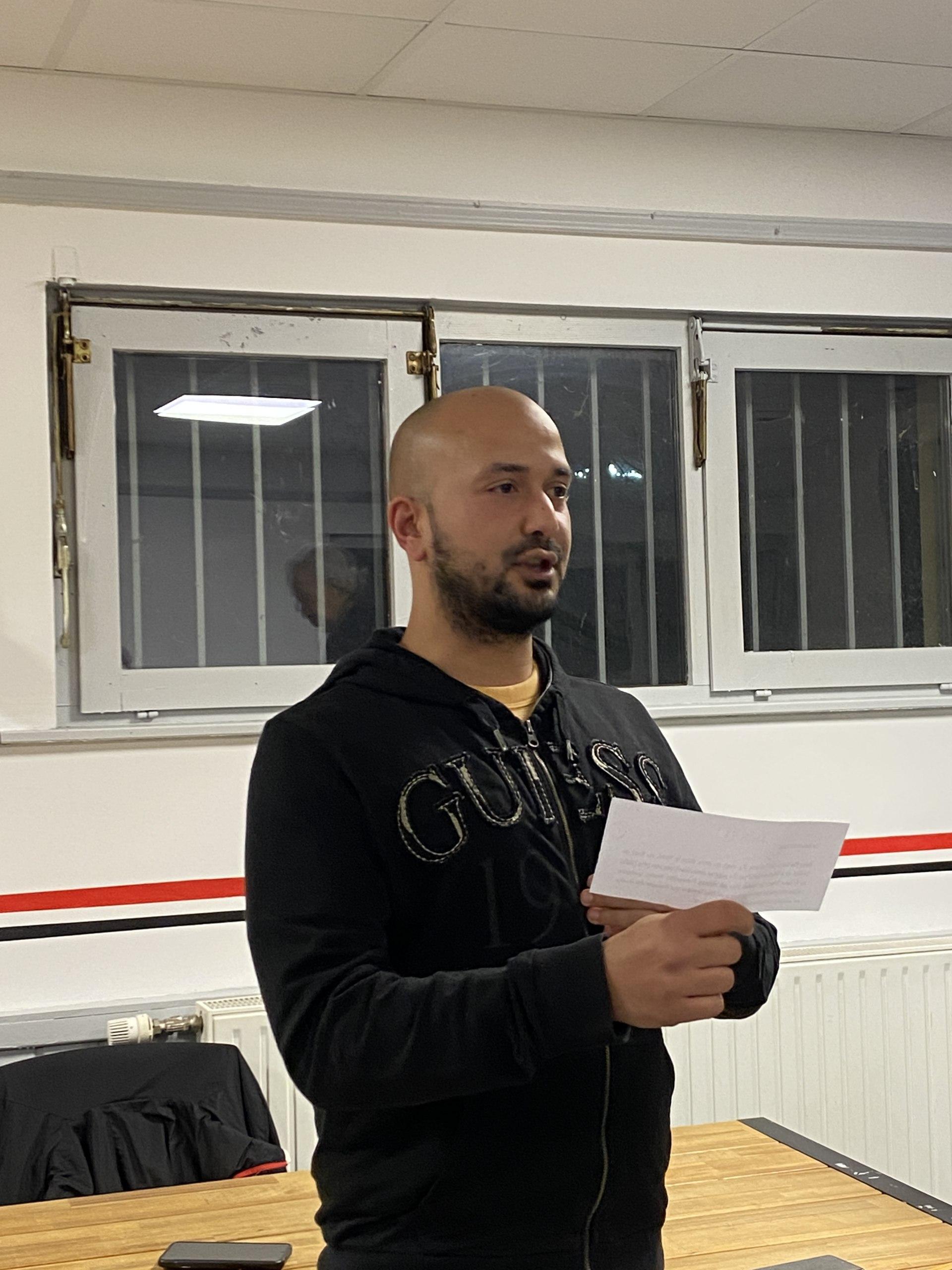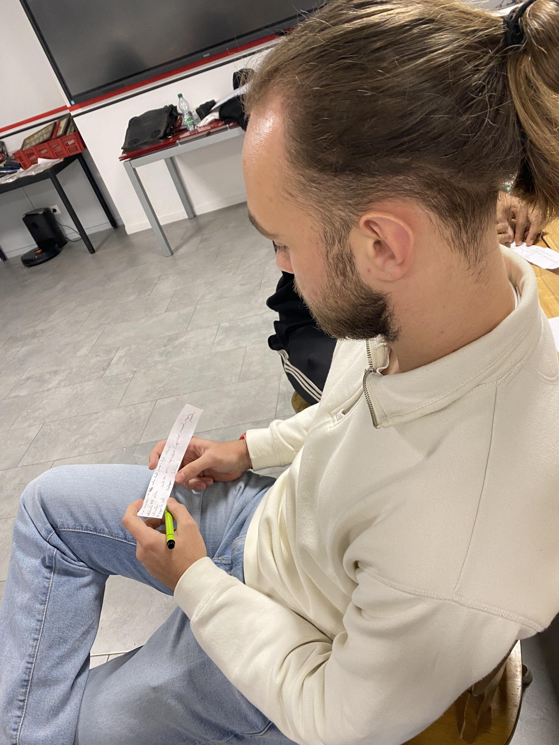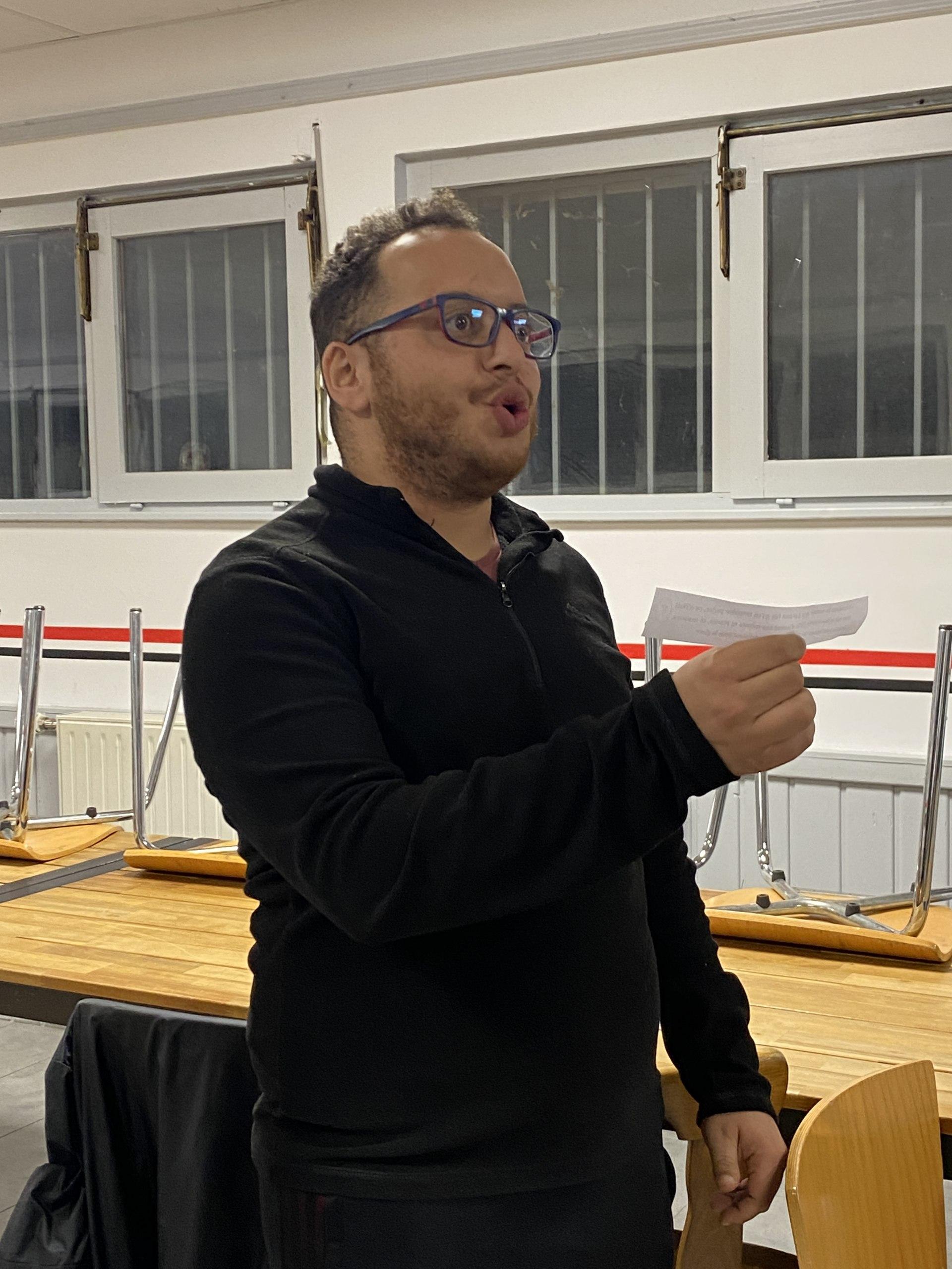 Comme le club-house de l’AS Musau accueille au même moment une réunion de préparation d’un prochain événement, les participants de l’atelier doivent non seulement dépasser leur timidité, mais aussi oser parler à haute voix devant du public. Alors, pour les y aider, Jean propose au groupe une prise de parole collective, puis par binôme et enfin individuellement. La méthode semble bonne car le naturel revient et les participants se lâchent assez rapidement et se prêtent au jeu.