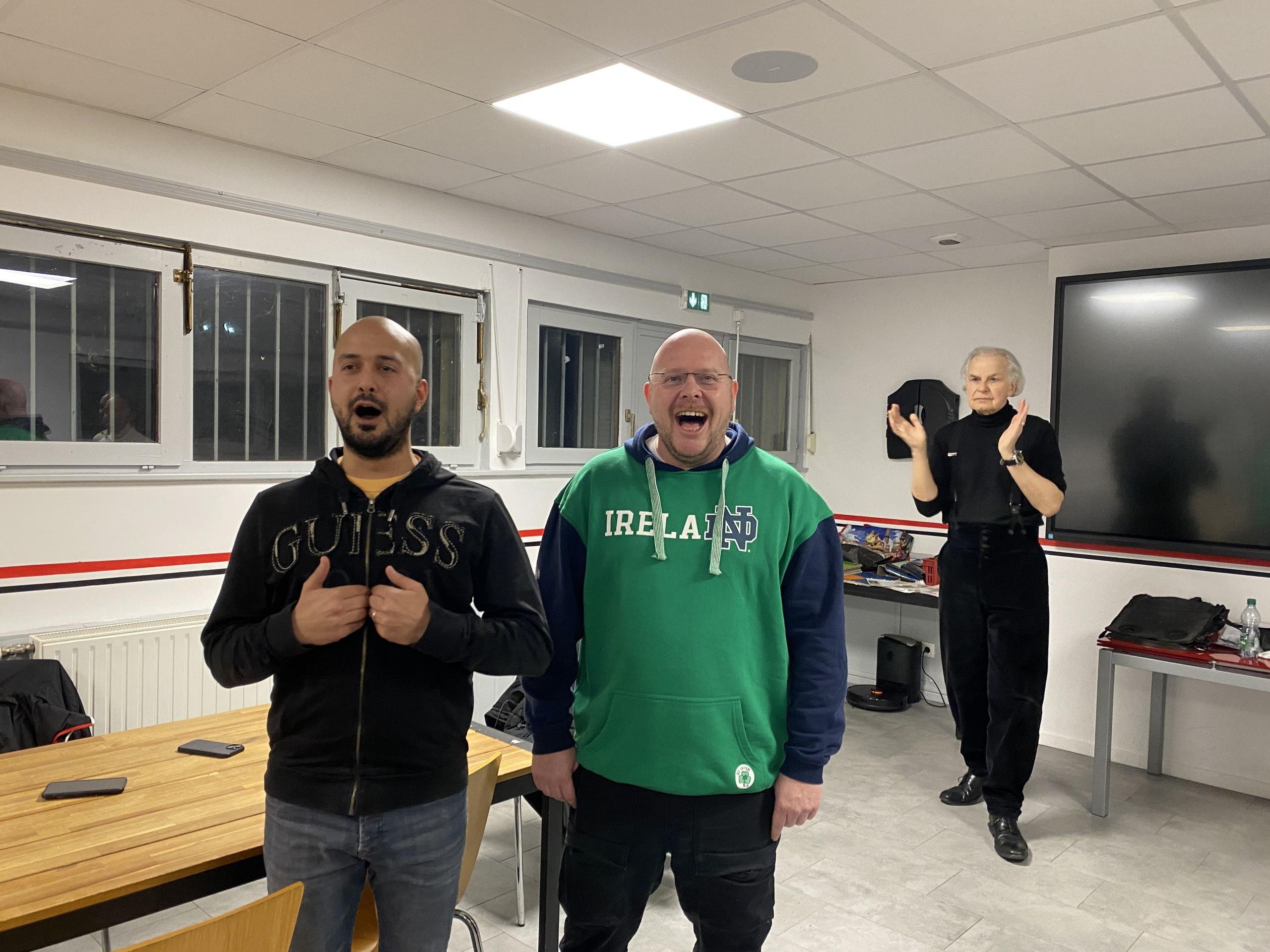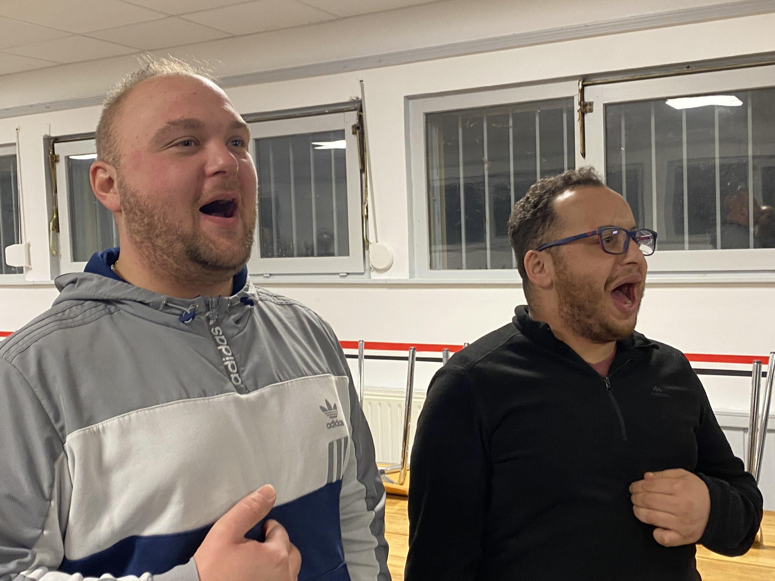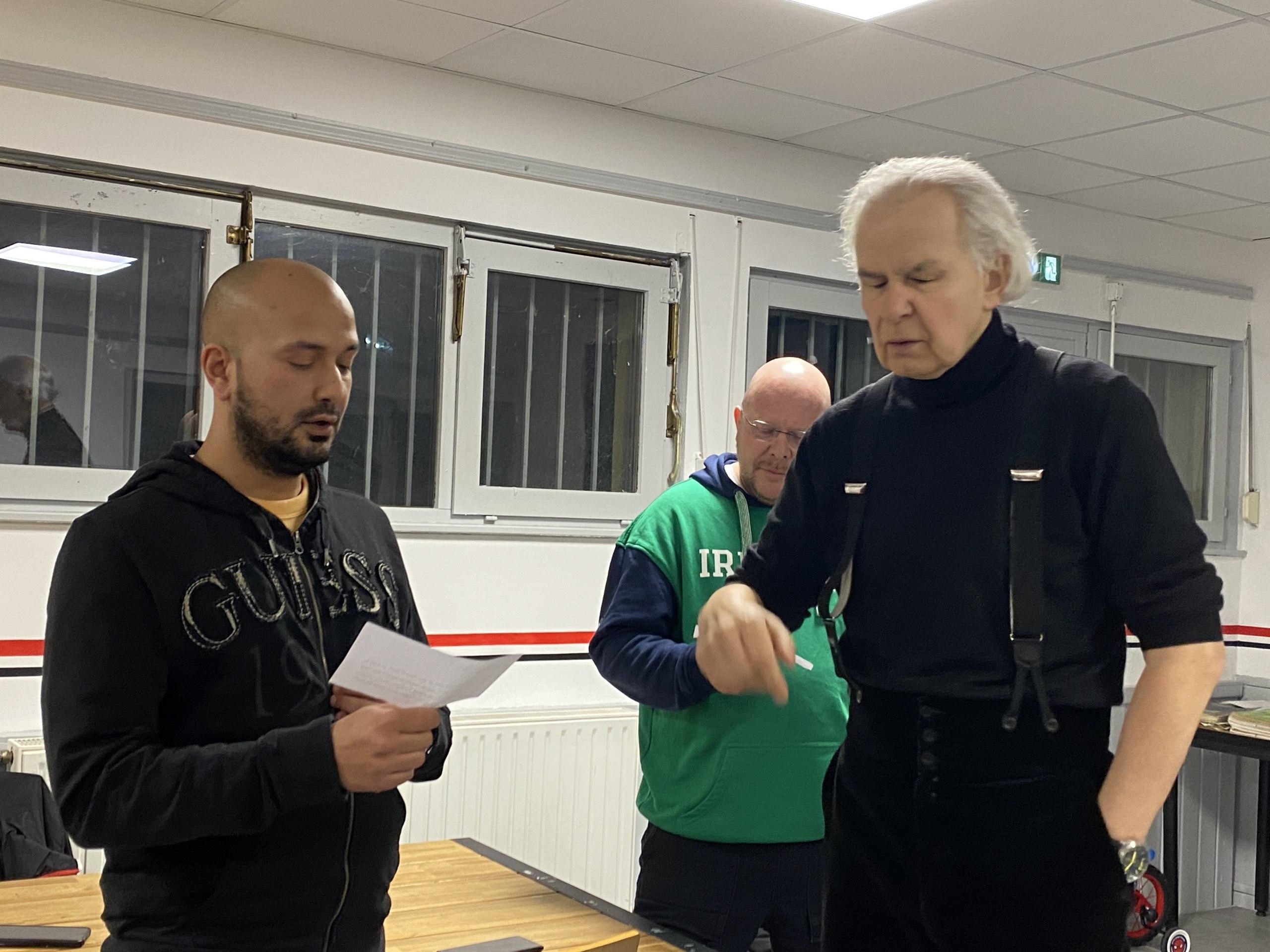 Comme le club-house de l’AS Musau accueille au même moment une réunion de préparation d’un prochain événement, les participants de l’atelier doivent non seulement dépasser leur timidité, mais aussi oser parler à haute voix devant du public. Alors, pour les y aider, Jean propose au groupe une prise de parole collective, puis par binôme et enfin individuellement. La méthode semble bonne car le naturel revient et les participants se lâchent assez rapidement et se prêtent au jeu.