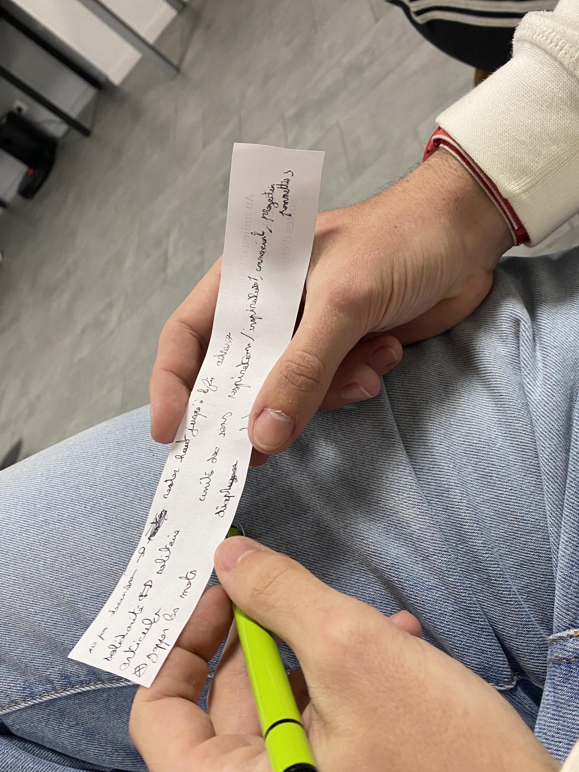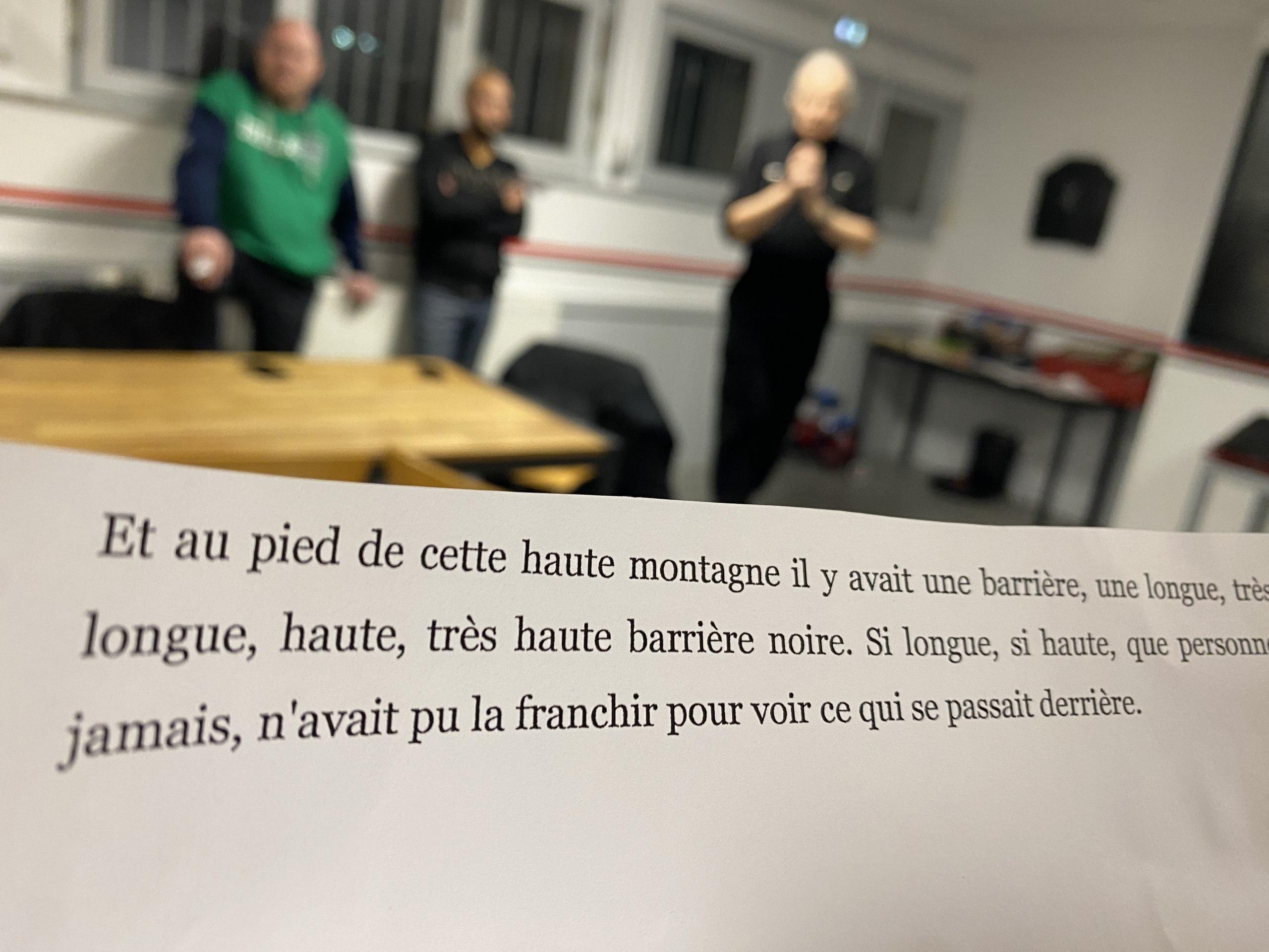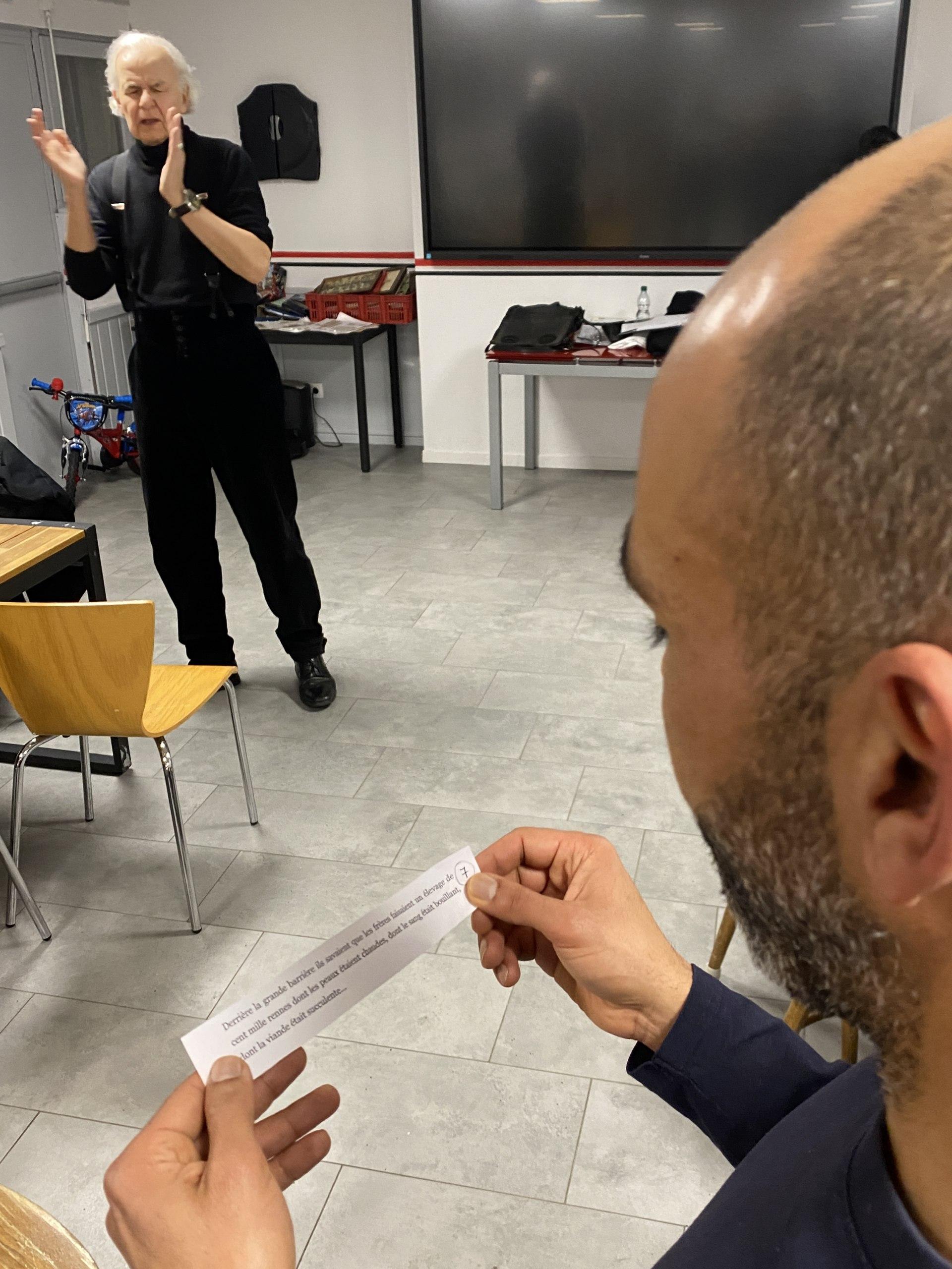 Pour commencer l’atelier, Jean distribue un texte différent à chaque participant. Chacun doit ensuite le lire normalement, puis à voix haute, puis en articulant chaque syllabe, puis à voix haute de façon plus fluide.