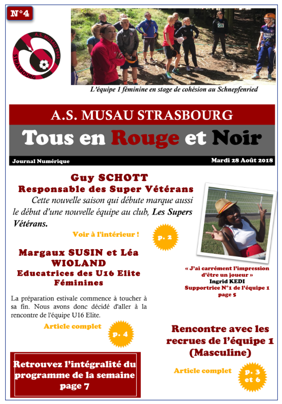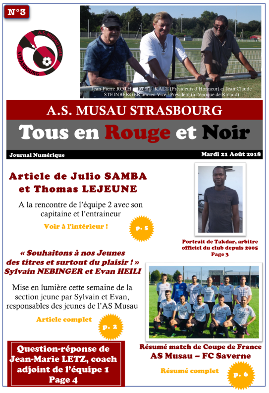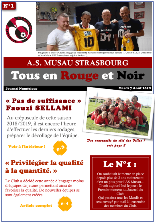 A l’occasion des 80 ans de l’AS Musau, nous allons tenter de recréer un journal numérique en ligne. Si les archives de 2018 nous rappellent un journal ambitieux, diffusés par e-mail à raison d’un par semaine, notre ambition 2025 sera plus modeste. Il faut dire qu’entre temps, la communication numérique s’est diversifiée : site web, réseaux sociaux, affichage dynamique au club-house, …. Ce nouveau journal en ligne dépendra de vos réactions et vos envies d’infos en rouge et noir.