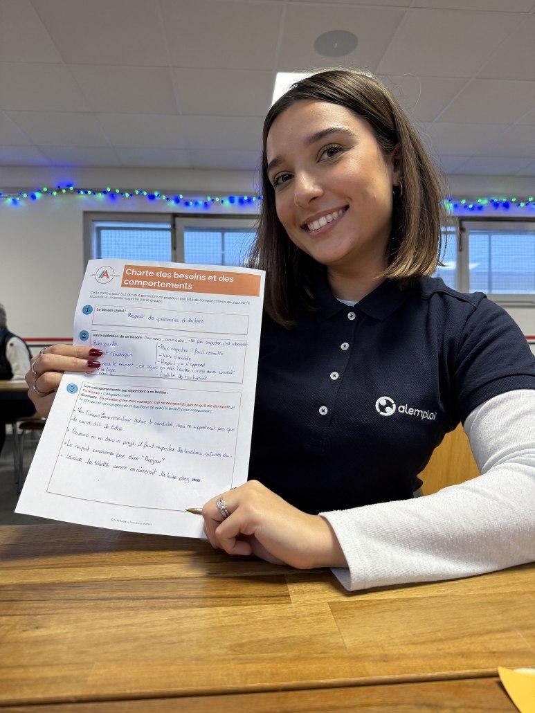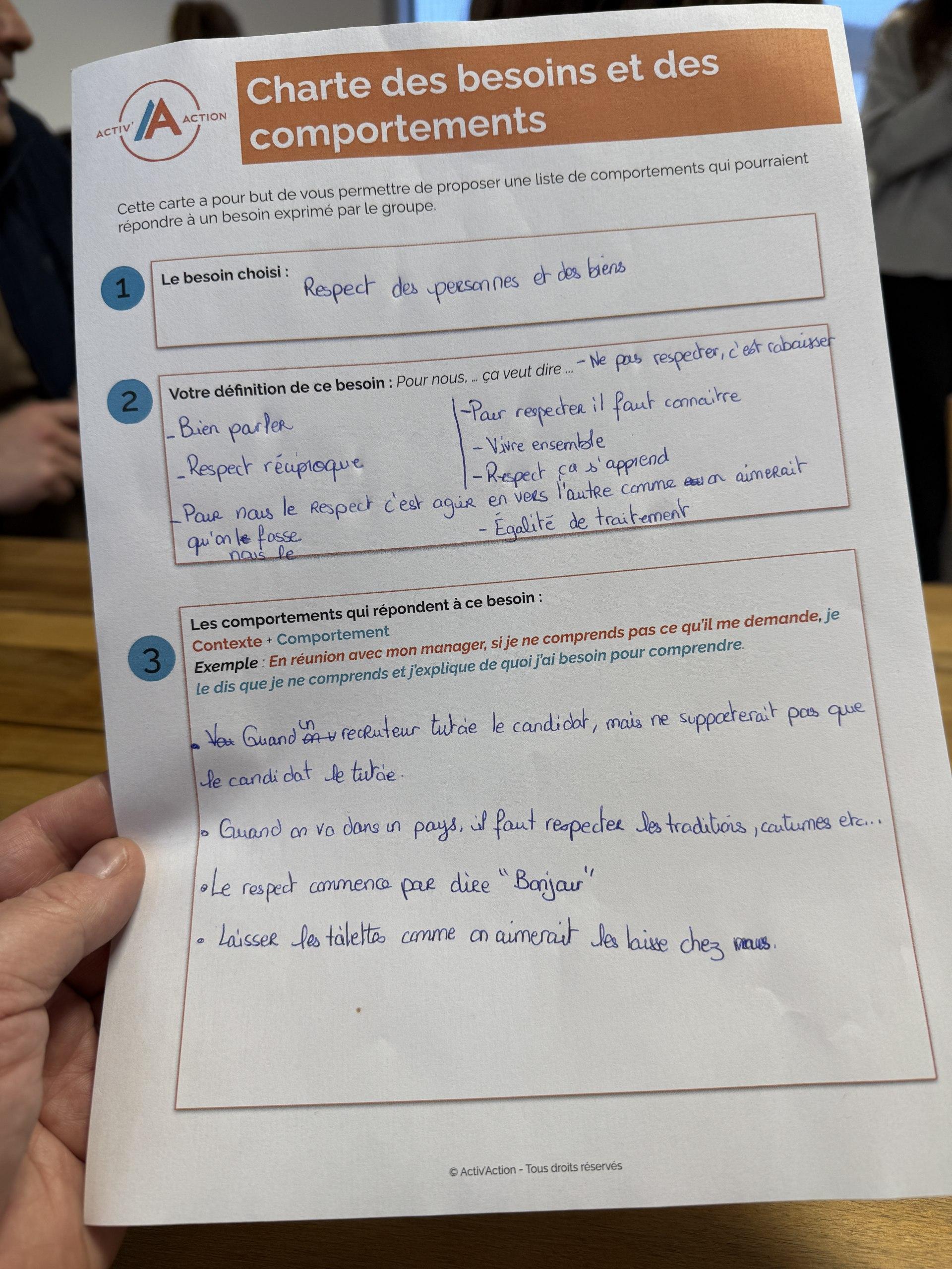 Enfin, Marie nous demande de nous mettre d’accord sur un enjeu fort que nous avons partagé et de le creuser en nous aidant d’un modèle de « Charte des besoins et des comportements ». A ma table, nous choisissons de creuser la notion de « Respect ». Si le plus dur consiste à trouver une définition idéale du respect, nous arrivons à trouver de nombreux exemples pour entendre nos points de vue complémentaires et très explicites.