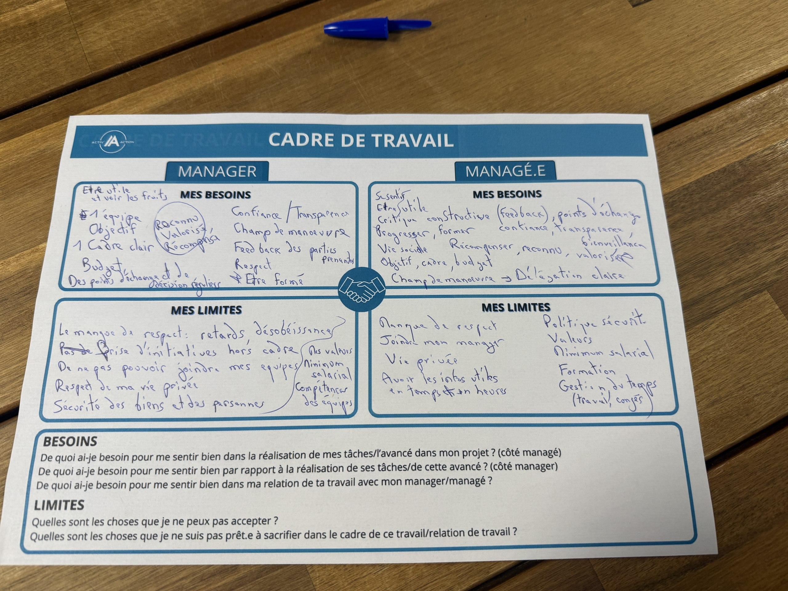 Marie distribue ensuite à chaque sous-groupe un tableau « Cadre de travail » et nous demande de réfléchir aux besoins nécessaires et aux limites acceptables dans leur relation entre manager et managé. A nouveau, les dialogue reprend au sein de chaque table et les feuilles se remplissent.