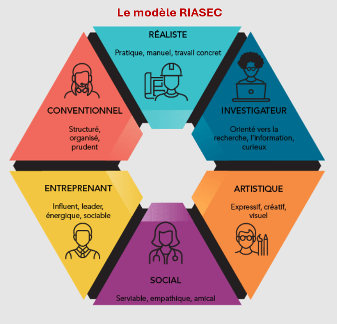 Le modèle RIASEC, développé par John L. Holland, identifie six types de personnalité qui aident à orienter les choix professionnels. L’acronyme RIASEC sert à rappeler les types.